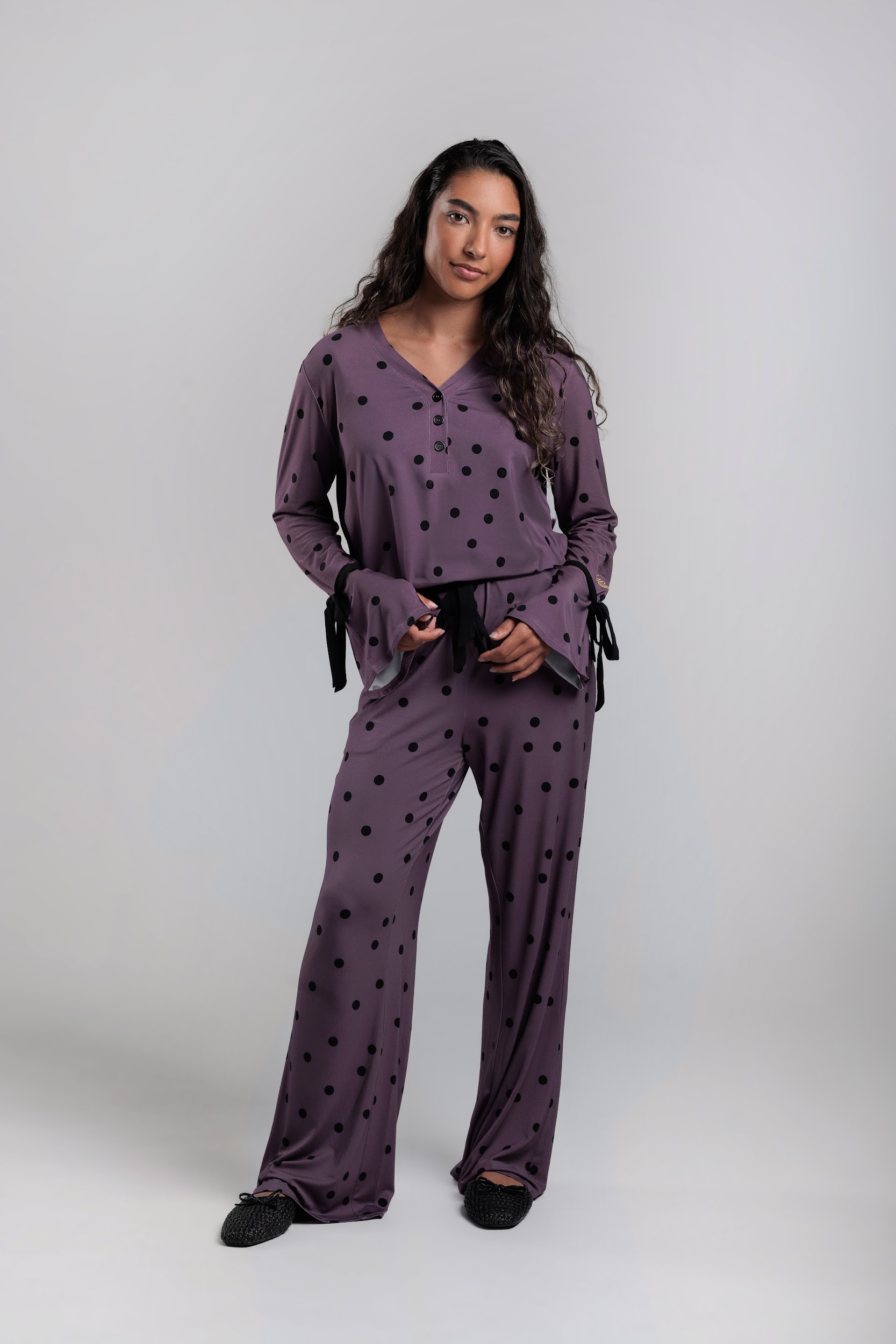 “ Noire’ ” pajama set is your door to the fashionable classy sleepwear and loungewear world. The combination of the chic style, the ultra-soft moisture- wicking fabric and the premium detailed craftmanship, makes it a need for your bed and lounge time. Enjoy the supreme comfort, great quality, and unique style in mind with this Sleepwear. This nightwear long sleeve purple PJ set is perfect choice for Honeymoon, Valentine’s Day, Anniversary, holiday, Bedroom, or every has a gift for your wife, girlfriend, mom, daughter, or friend. This Jammie set is the multiple use sleepwear for breastfeeding, perfect nursing sleepshirt for postpartum women and casual chic bridal PJ set. it is a piece of art you can add to your bedtime closet. It is packaged in a luxurious gift box ready for any heartwarming surprise.