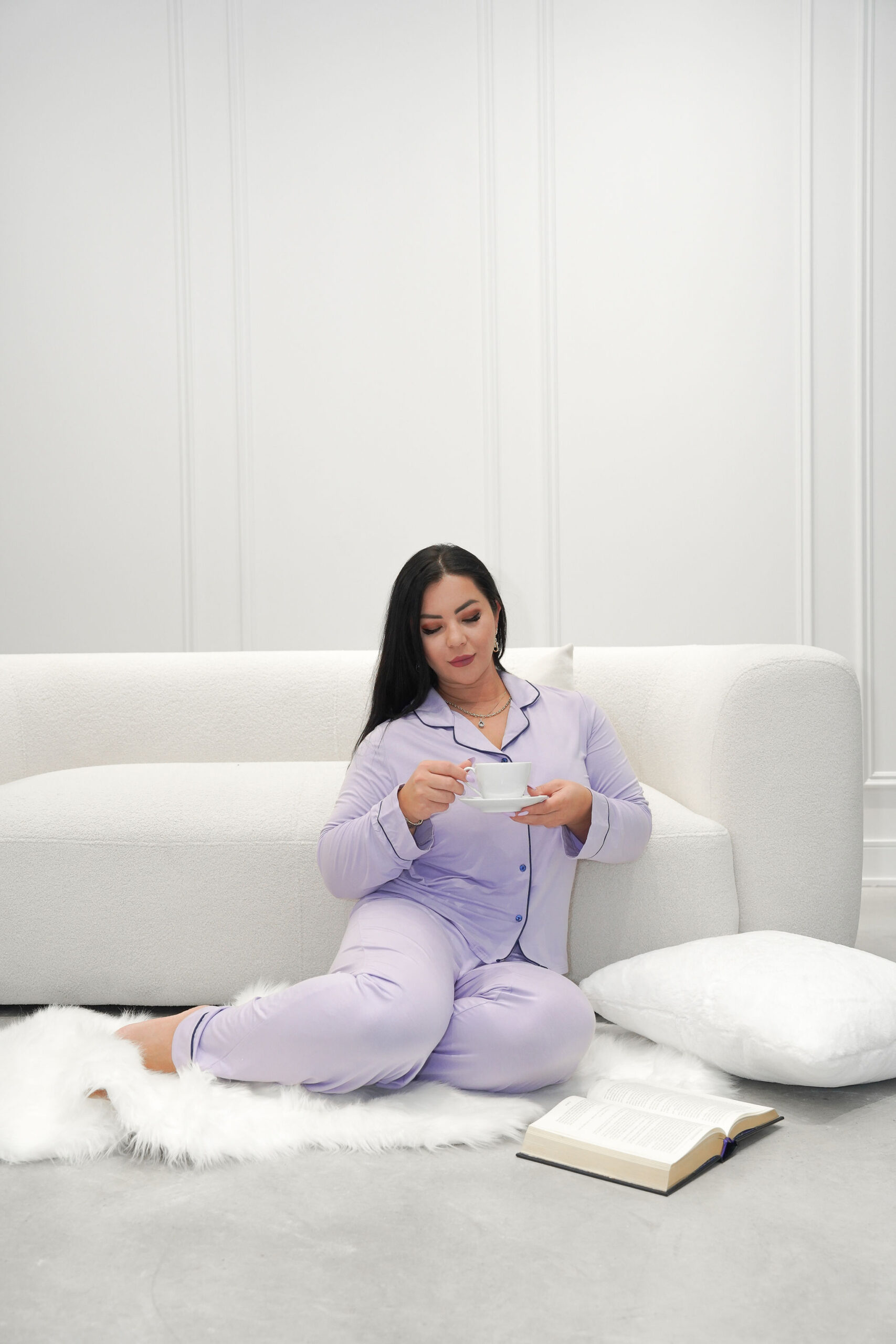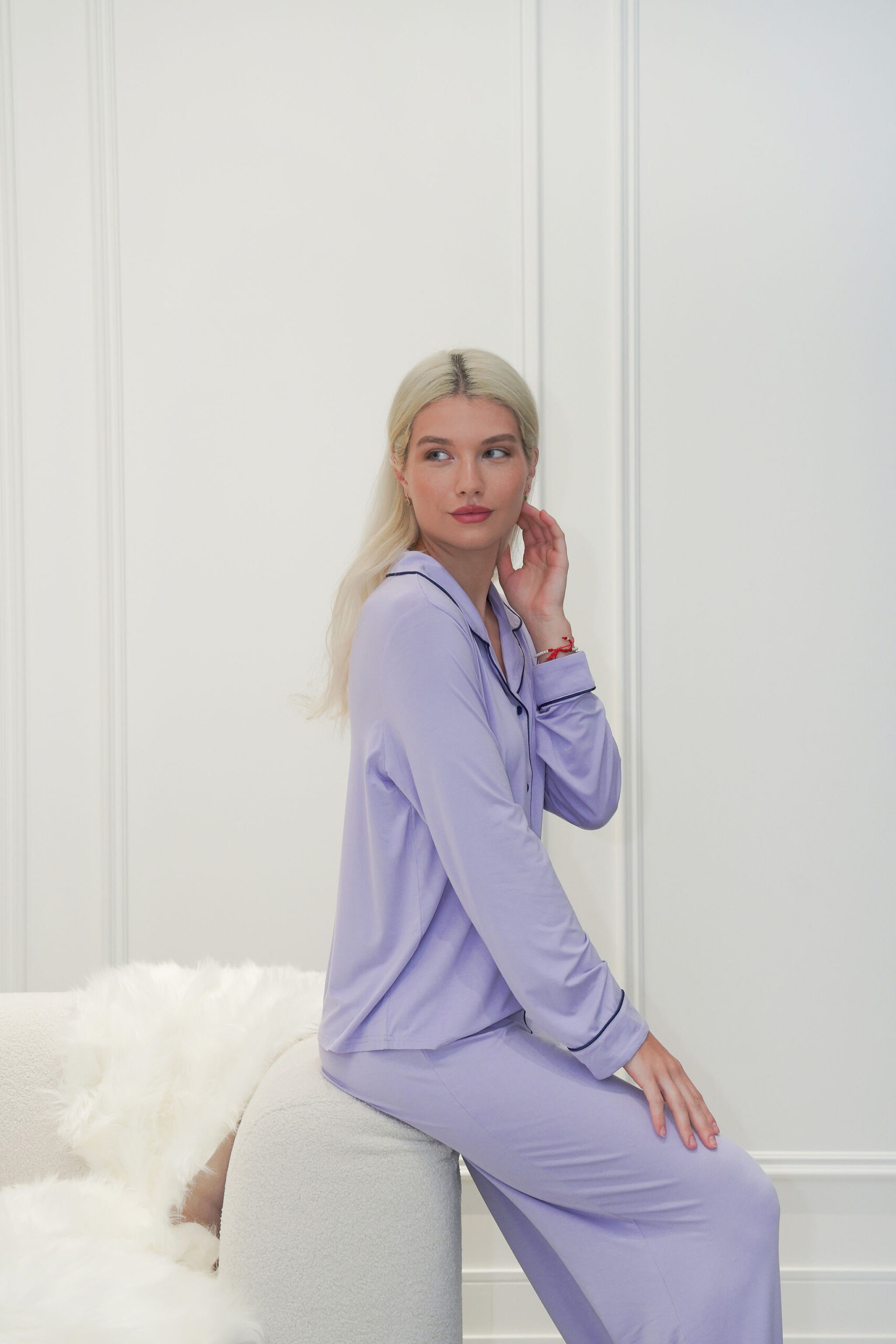 “Delila” pajama set is your door to the fashionable classy sleepwear and loungewear world. The combination of the chic style , the ultra-soft moisture- wicking fabric and the premium detailed craftmanship, makes it a need for your bed and lounge time. Enjoy the supreme comfort, great quality, and unique style in mind with this Sleepwear. This nightwear long sleeve purple PJ set is perfect choice for Honeymoon, Valentine’s Day, Anniversary, holiday, Bedroom, or every has a gift for your wife, girlfriend, mom, daughter, or friend. This Jammie set is the multiple use sleepwear for breastfeeding, perfect nursing sleepshirt for postpartum women and casual chic bridal PJ set. it is a piece of art you can add to your bedtime closet. It is packaged in a luxurious gift box ready for any heartwarming surprise.