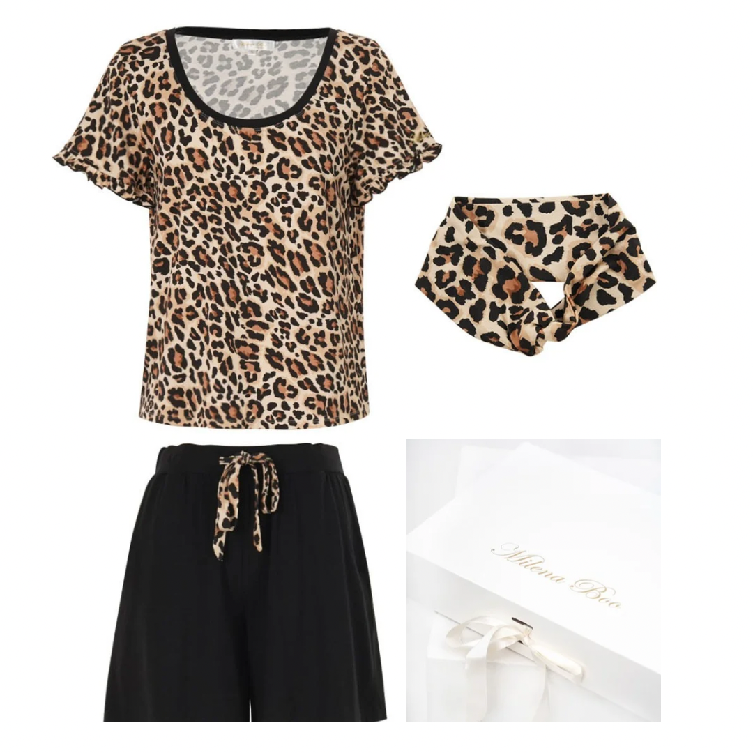 Walk to your bed with this soft and elegant short pajama set. This cute Jammie has a black round neck animal print top and stylish details featured with the ruffles around the short sleeves. It comes with contrast black comfy adjustable waist mid-thigh length shorts that has the same stylish silky animal print belt as the top. this beautiful shorts PJ set packaged in a luxurious gift box that makes it a perfect stylish gift of all time.
