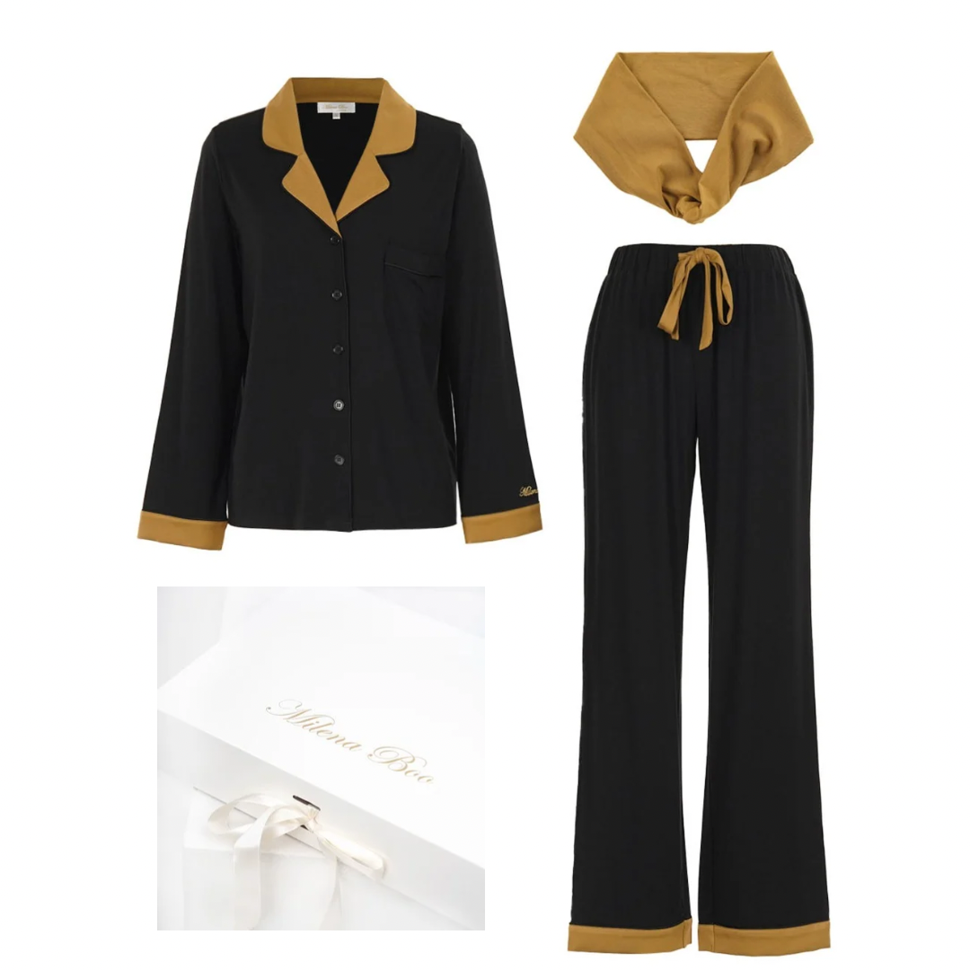 Our Noire’ classic, chic and ultra-soft Pajama set is a must for your bed time routine. Make sure to make every night a luxuriously soft affair with this Jammie set. It has an ultra-soft button-down black with Champaign contrast tips sleepshirt, Notch collar, V neck, navy blue buttons and silky piping, and comes with matching comfy and flowy contrast Champaign tips pants. it is your chic gift of all time packaged in a very box for yourself and your loved ones.